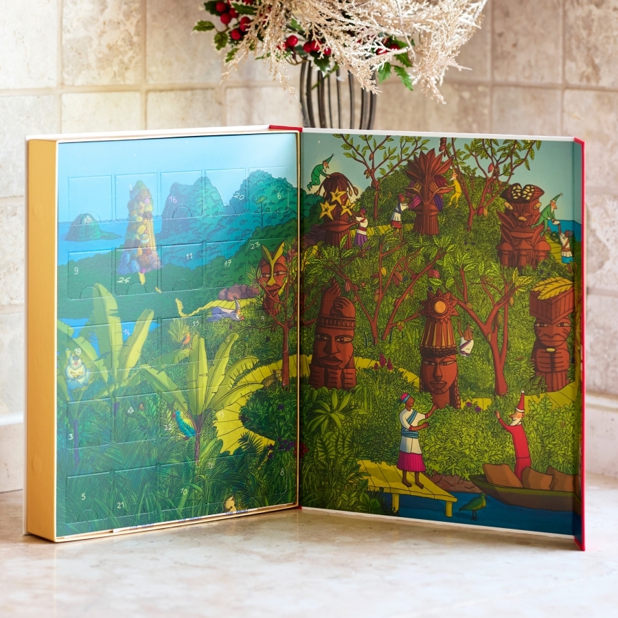 中世の洋書をイメージした箱を開けると、そこには西アフリカサントメ島のクリスマスのファンタジックな世界が広がります。